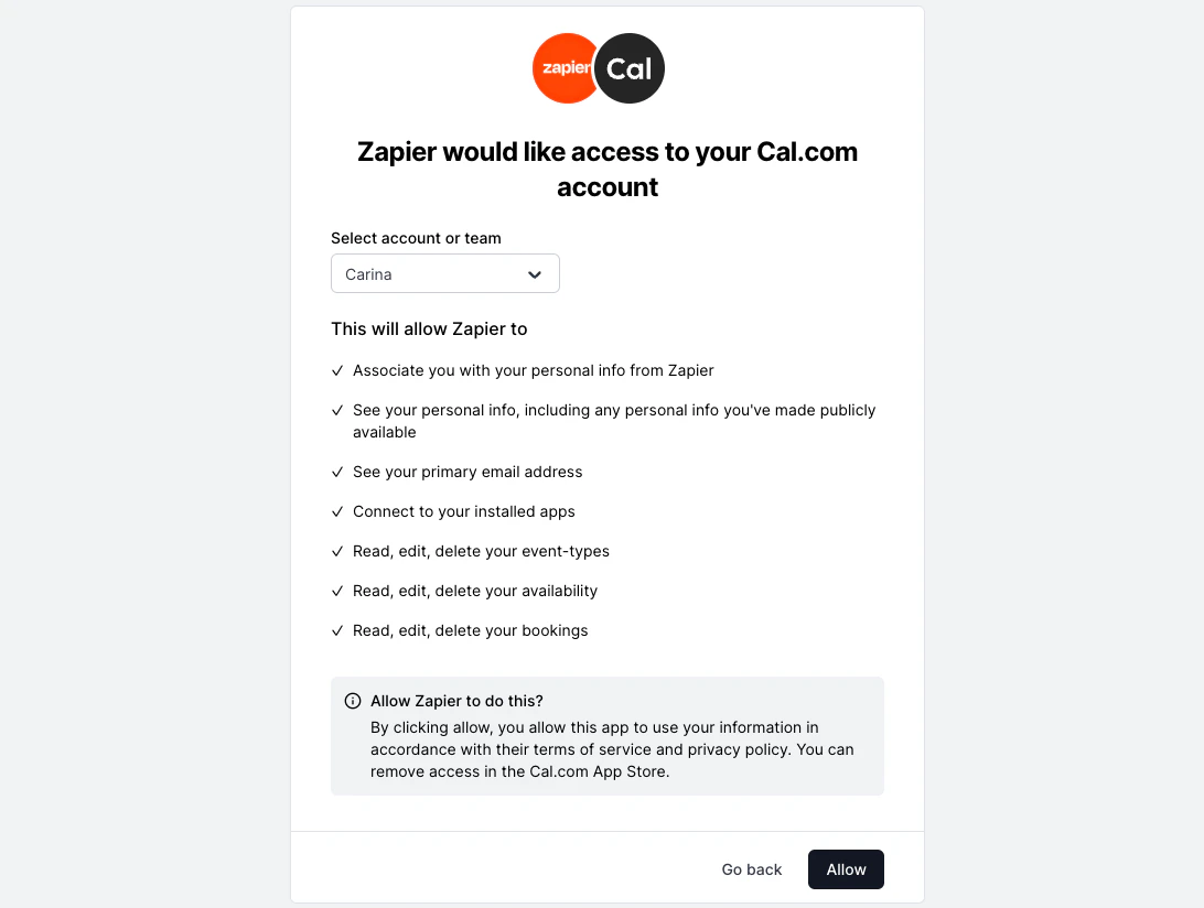 As an example, you can view our OAuth flow in action on Zapier. Try to connect your cal.com account here. To enable OAuth in one of your apps, you will need a Client ID, Client Secret, Authorization URL, Access Token Request URL, and Refresh Token Request URL.